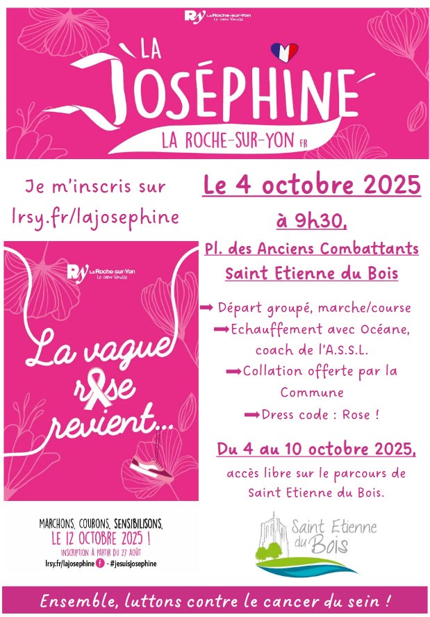 🌸Cette annĂ©e encore la Commune de St Etienne du Bois s’associe Ă la Ville de La Roche sur Yon pour proposer un parcours JosĂ©phine dans le cadre de la lutte contre le cancer du sein.