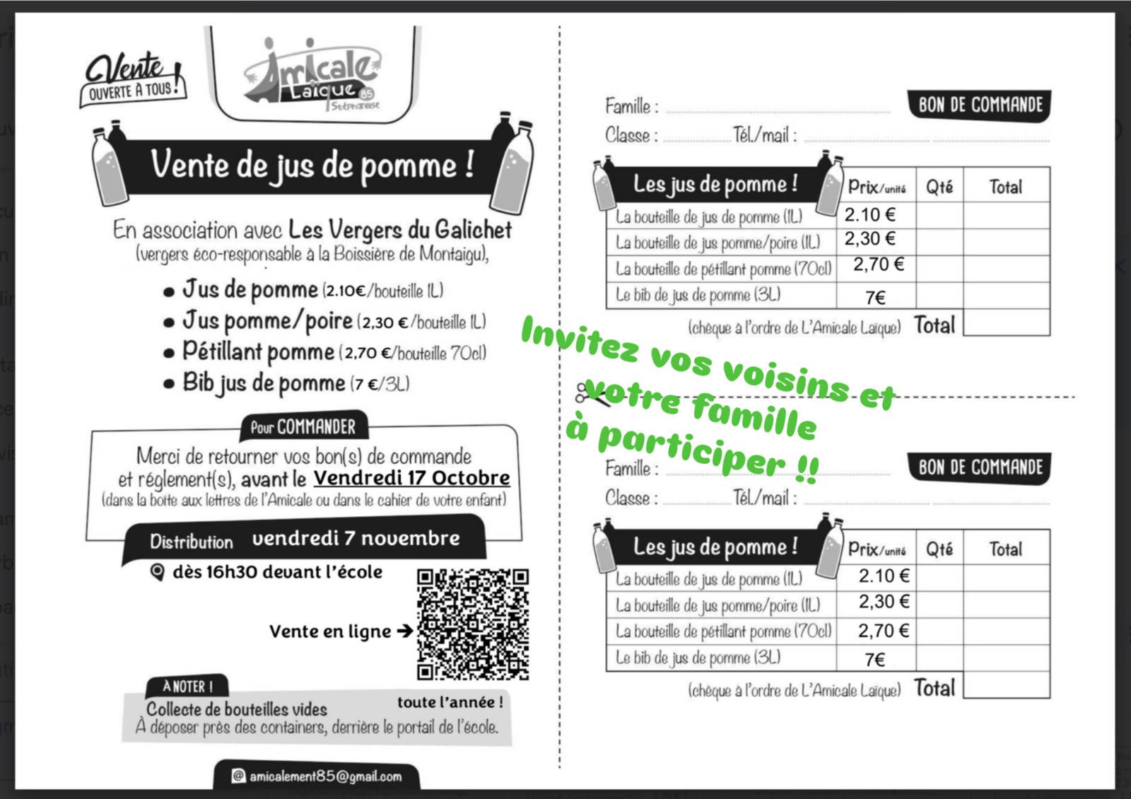 Cette année, l’Amicale Laïque et l’école publique comptent sur vous pour battre tous les records de vente de jus de pomme! Alors on demande à tout le monde autour de soi de participer ! On demande à mémé, à tante Jeanne, on demande à Robert le voisin, à Marie la collègue de travail, et on demande à Pierre de la salle de sport combien de bouteilles ils souhaitent commander. Délice absolu garanti!
