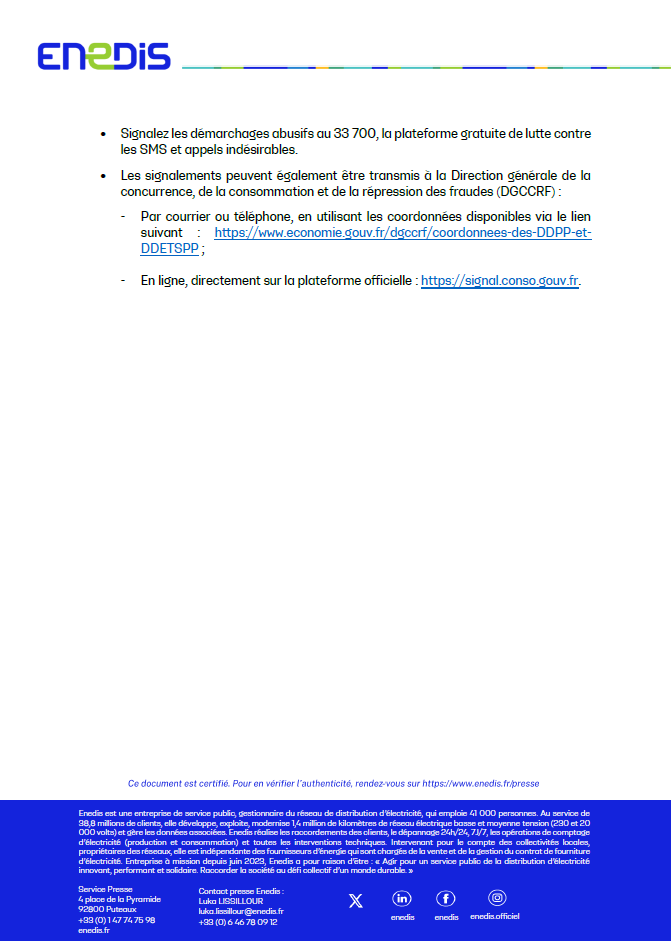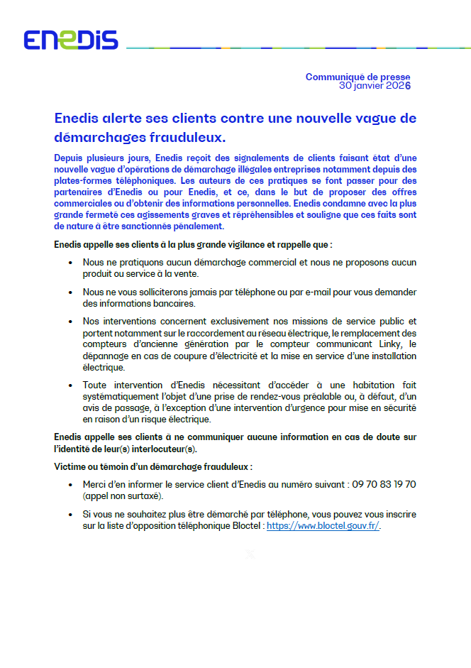 Message d’information d’Enedis concernant des démarchages frauduleux.