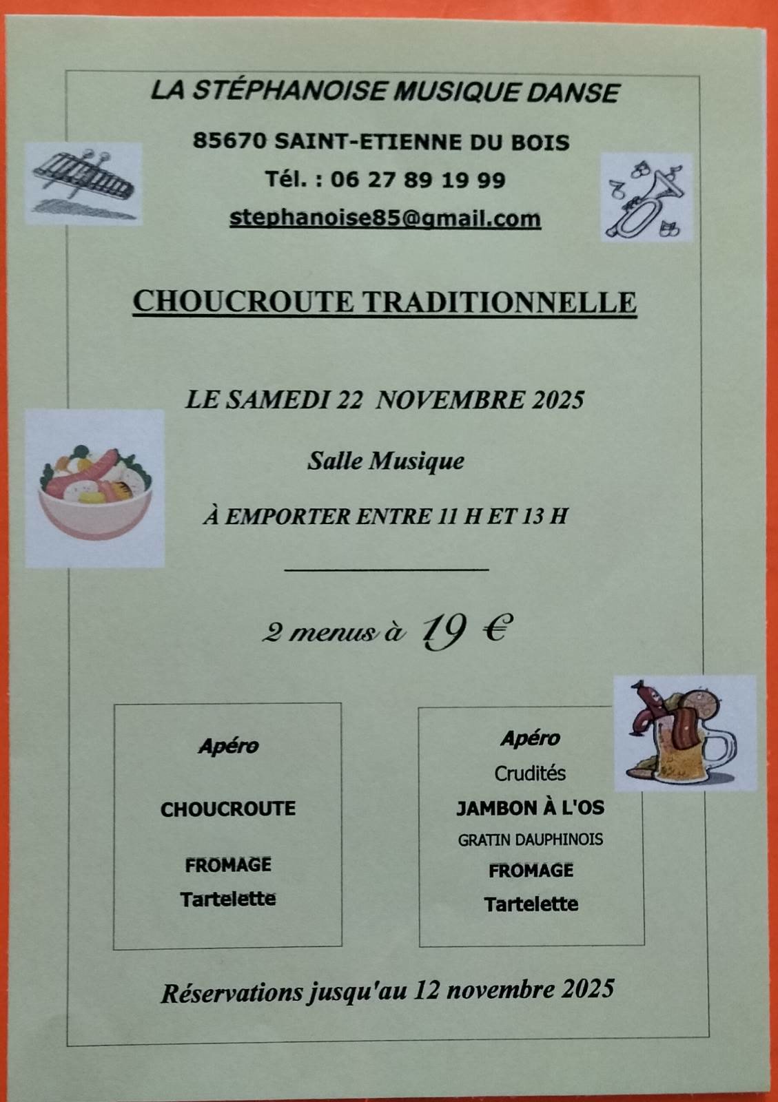 Réservations avant le 12 novembre 2025 : 🎺 06.27.89.19.99 ou 🎸 stephanoise85@gmail.com 🥁